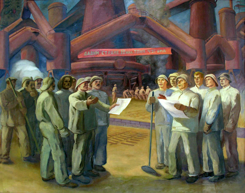 El tema de la exposición es el canon del realismo socialista con sus protagonistas: los mineros, los constructores y los agricultores.
